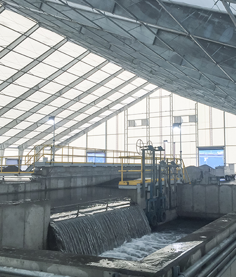 The structure, built over a wastewater facility, protects equipment dewatering ash and features a ventilation system with six air replacements per hour.